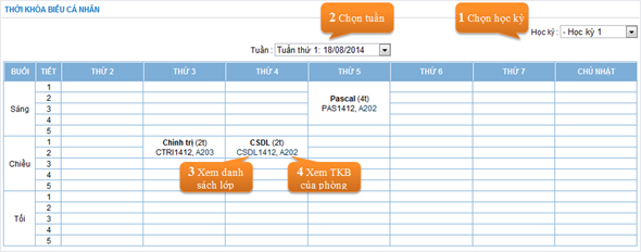 Để xem thời khóa biểu, vào Thông tin → chọn mục Thời khóa biểu. Lưu ý: sinh viên chú ý xem thời khóa biểu thường xuyên theo từng tuần, mặc định hệ thống sẽ lấy tuần hiện tại.