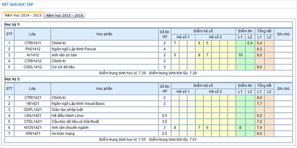 Liệt kê kết quả học tập theo từng năm học, học kỳ cho sinh viên. Để thực hiện vào Thông tin → chọn mục Kết quả học tập.