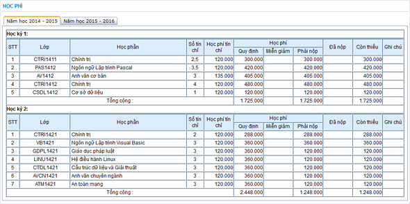 Hiển thị chi tiết thông tin học phí cho từng lớp học phần, tổng hợp học phí quy định, miễn giảm, đã nộp, còn lại,…