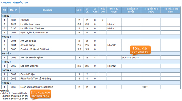 Là kế hoạch đào tạo chi tiết theo từng học kỳ áp dụng cho lớp sinh hoạt của sinh viên. Trong đó sinh viên phải chú ý các ràng buộc (tiên quyết, học trước, song hành) và điều kiện đăng ký của các nhóm tự chọn.