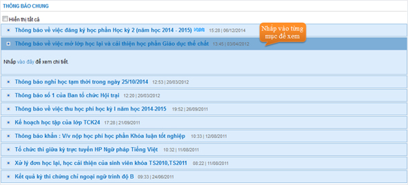 Là những nội dung thông báo dành cho sinh viên toàn trường, để xem vào Thông báo → chọn Thông báo chung.