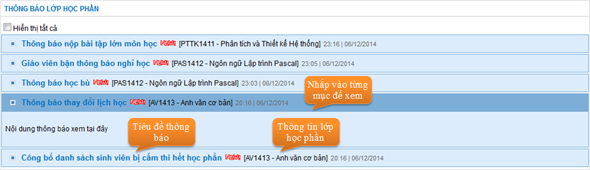Là những nội dung do chính giáo viên giảng dạy (hoặc Phòng Đào tạo) thông báo cho sinh viên các lớp học phần, chỉ những sinh viên nằm trong các lớp học phần nói trên mới xem được nội dung. Để thực hiện vào Thông báo → chọn mục Cho lớp học phần.