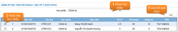 Chức năng này chỉ được thực hiện trong khoảng thời gian đăng ký học mà Phòng Đào tạo thông báo. Việc lựa chọn các lớp học phần phụ thuộc hoàn toàn vào sinh viên trên cơ sở đảm bảo thời gian và các quy định về số tín chỉ tối thiểu, tối đa, điều kiện tiên quyết, học trước, học song hành,…
